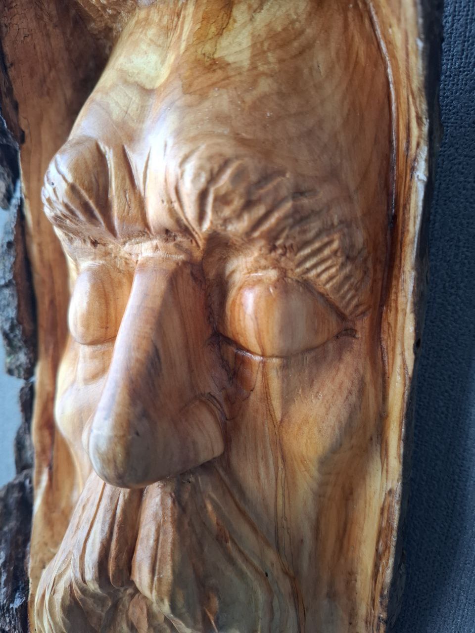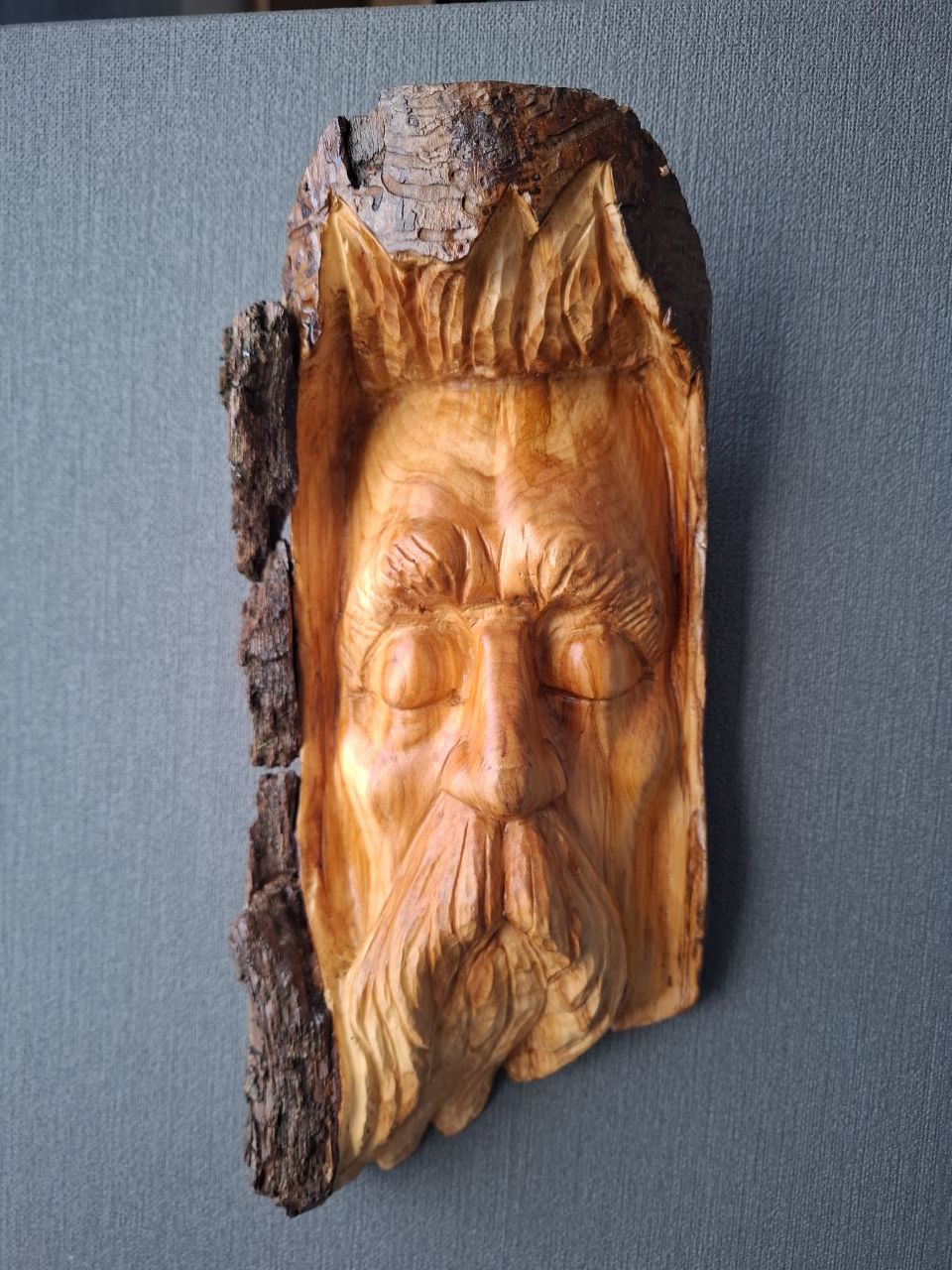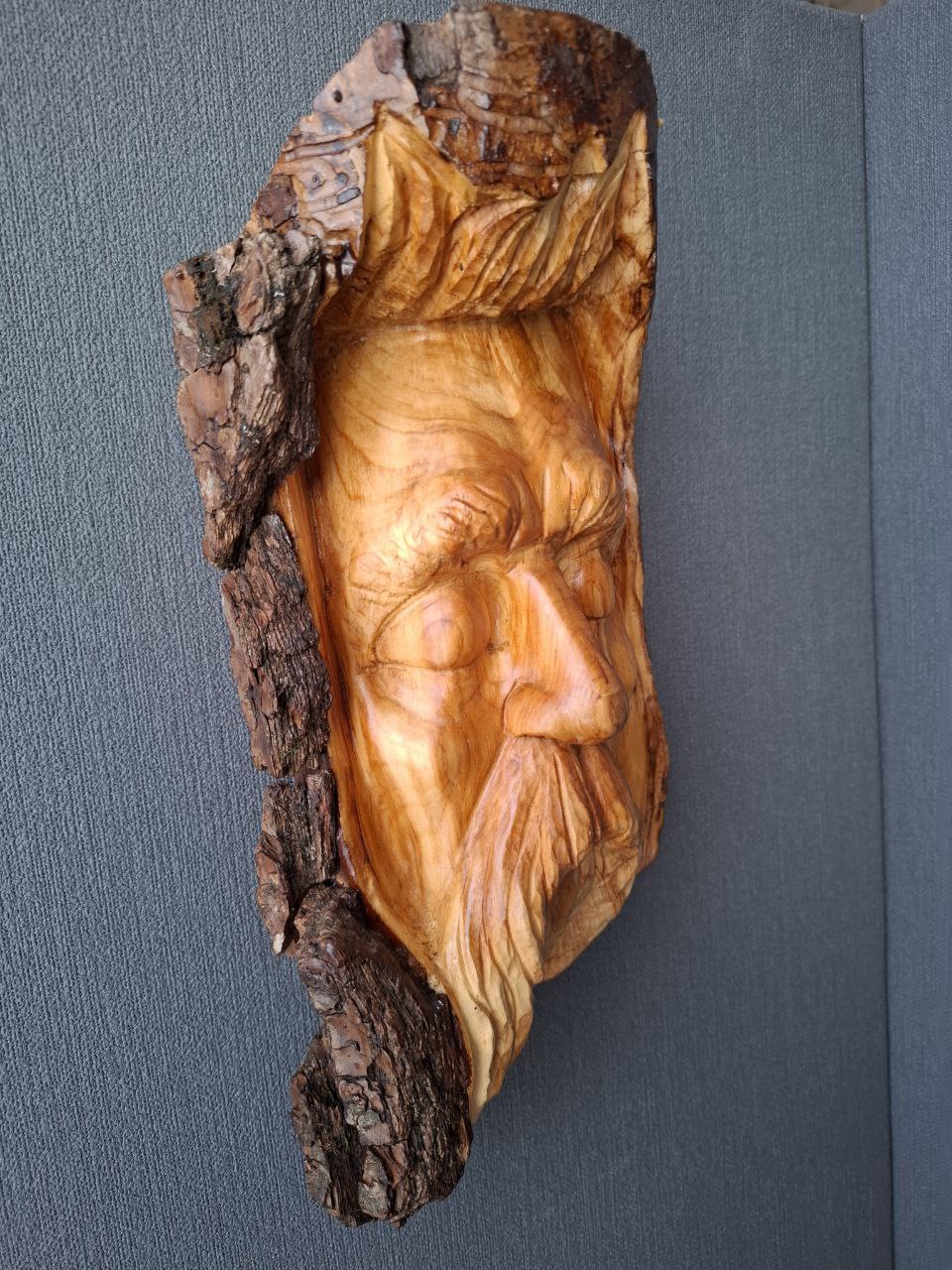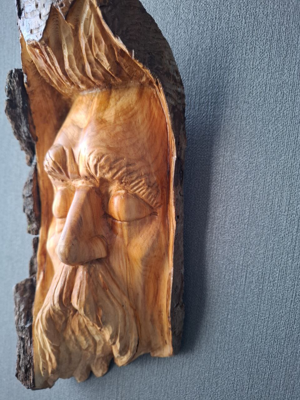 Dieses handgeschnitzte Holzgesicht entstand aus Fundholz, das von der Natur geformt und vom Künstler neu interpretiert wurde.