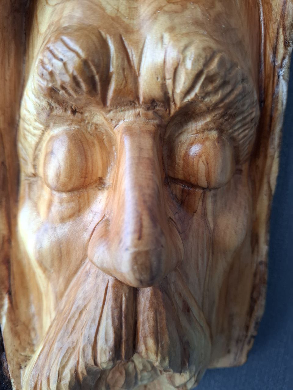Ein ausdrucksstarkes, handgeschnitztes Holzgesicht aus Fundholz.