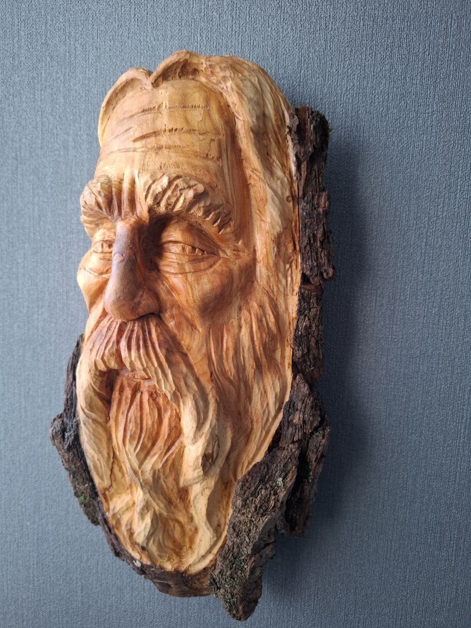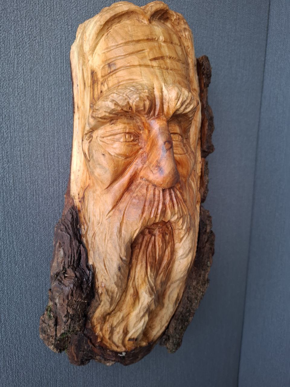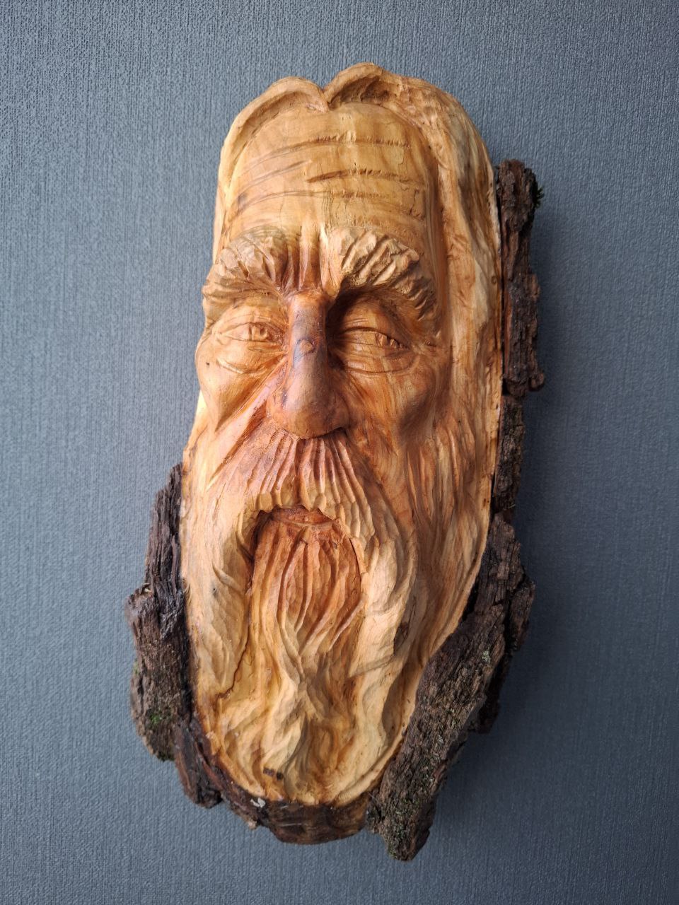 Dieses handgeschnitzte Holzgesicht entstand aus Fundholz, das von der Natur geformt und vom Künstler neu interpretiert wurde.