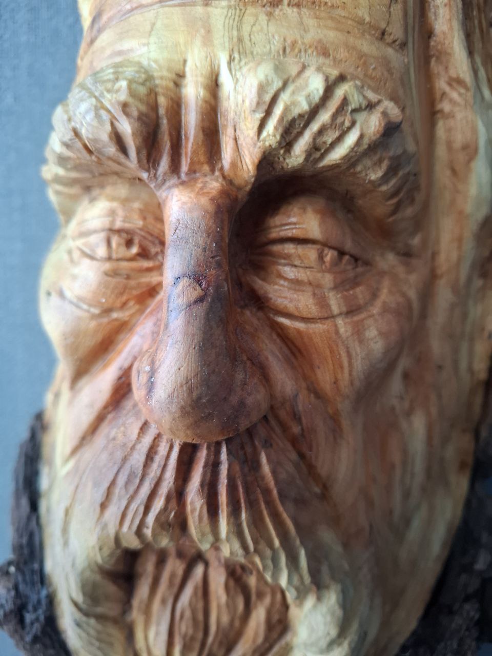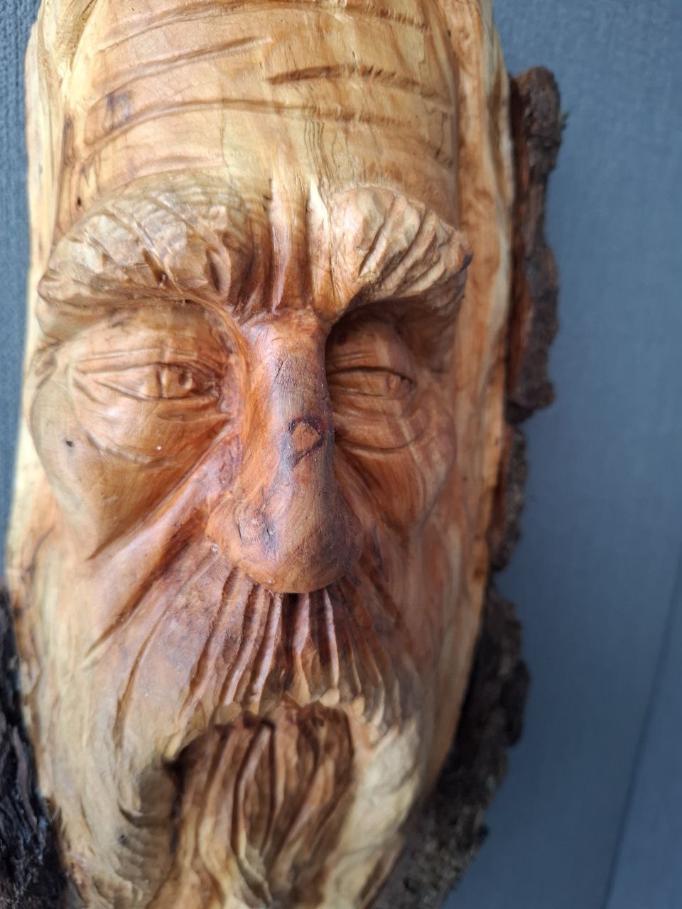 Ein ausdrucksstarkes, handgeschnitztes Holzgesicht aus Fundholz.